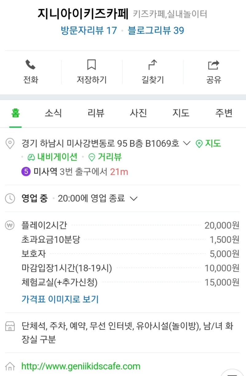너무 넓어서 아이가 달려버리면 찾기가 힘들었어.구입할 때 스티커를 주고 아이 옷에 붙이라고 해도 혹시 잃어버리더라도 찾기 어렵지는 않을 것 같다.왼쪽에는 푸드코트가 있고 음료와 음식도 판매하고 있다.커피랑 에이드 차 종류도 있어.음식도 파스타, 볶음밥, 떡볶이 등 여러 종류가 있어서 먹는 사람도 꽤 많았다.음식을 먹으면 시간이 초과될 경우 30분까지 면제해주는 것 같았다.미술 수업과 만들기 등 키즈 클래스도 진행했다.영어 놀이 수업도 하는지 교실이 따로 있었다.이열 사다리 놀이시설마다 안전수칙이 적혀 있다.미니 슬라이드 속도가 꽤 빨라서 아이가 좋아했다.토네이도 슬라이드안쪽에 베이비존이 있다.3세 이하의 권장 사항이지만 이곳에서 노는 아기는 많지 않았다.3세 이하의 권장 사항이지만 이곳에서 노는 아기는 많지 않았다.미니지퍼라인 짚라인인데 빠르지는 않아서 타기 편했어.마켓 놀이회전풍선 목마 이거 처음 보는 기구였는데 재밌었어.레드 슬라이드팡팡 터치 슬라이드 넓은 슬라이드가 있지만 그리 빠르지는 않다.암벽 놀이폴리자동차도 있지만 가끔 직원분들이 밀어주기도 한다.트램펄린이건 이름이 없었던 것 같은데 관으로 공을 넣으면 바람에 움직인다.수유실도 있다.수유실도 있다.정수기는 수유실 앞에 있다.중간에 화장실이 있는데 어린이용인 만큼 어른들은 상가 화장실을 이용하게 되어 있다.50m 네이버 더보기 / 오픈스트리트맵지도데이터x 네이버 / 오픈스트리트맵지도컨트롤러 범례부동산대로읍,면,동시,군,구시,도국지니아이키즈카페 미사점 경기도 하남시 미사 강변동로 95 그랑파사지 12BL B1층 B1069호 예약주소 : 경기도 하남시 미사강변동로95 그랑파사지 12BL 지하1층 연락처 : 0507-1457-5252영업시간 : 매일 10:00~20:00주차 : 2시간30분가능 #하남키즈카페 #미사키즈카페 #한남지니 #지니키즈카페 #미사지니 #지니아이키즈카페 #미사지니아이 #지니아이키즈카페미사점https://www.youtube.com/shorts/lorcjoCuVAQ