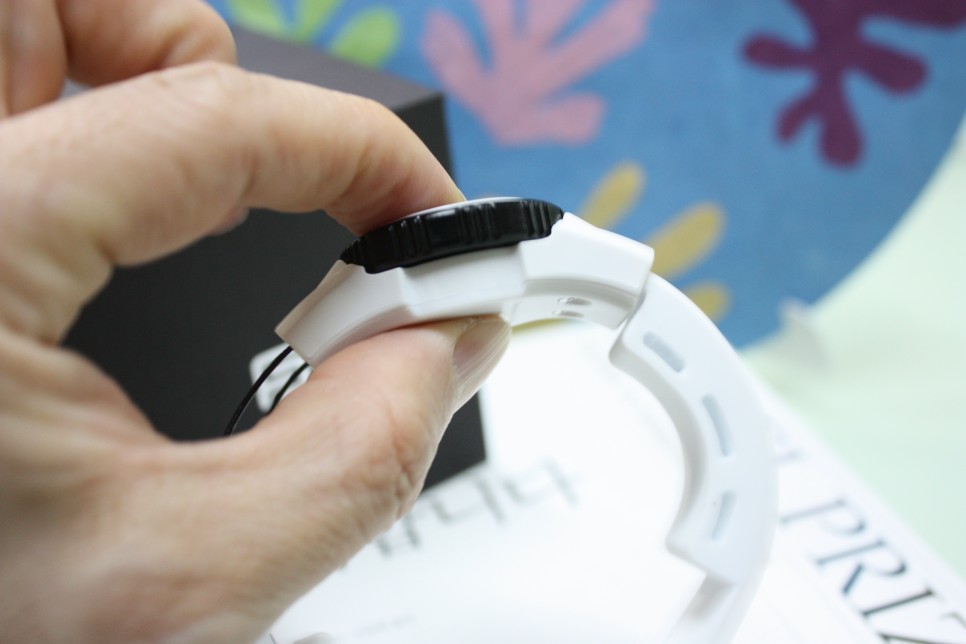 우선 다이얼은 Prosprosp e에서 나온 다이얼 모양으로, 그것을 돌리면 와이어가 양쪽으로 당겨지기 때문에 손목 터널 증후군의 보호대 역할을 할 수 있도록 되어 있습니다. 양쪽으로 튀어나온 두꺼운 부분들은 완충장치 역할을 하기 위한 공간이 비어있는 것도 알 수 있죠. 이런걸 생각하고 만들다니 꽤 오랜 연구를 한걸 볼 수 있죠.