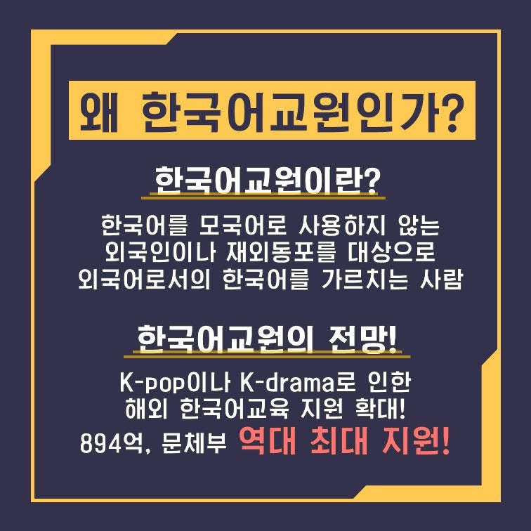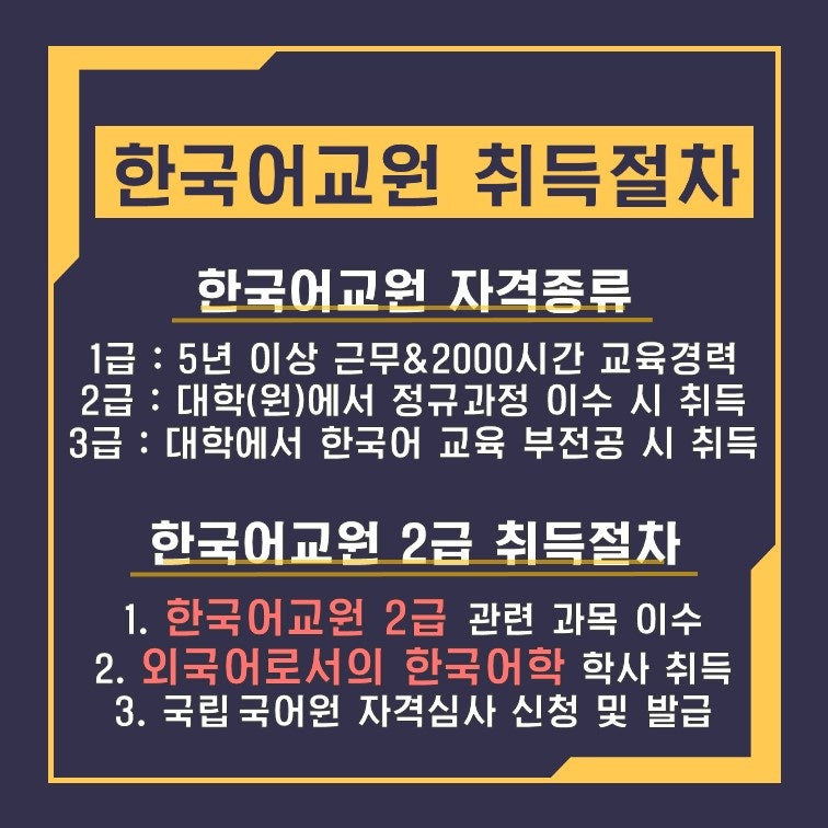 한류의 영향으로 한국어 교사에 대한 관심이 높아졌다.한국어 교사에 대한 관심은 필자의 경우 2004년 이후인데요. 2005년 7월 28일 이후 발효된 국어기본법의 영향으로 법적 기반의 자격증이 되는 발판이 되었다.모 대학 국제어학원에서 한국어교사 양성과정을 수강하고 3급 자격증을 취득할 수 있는 조건을 맞춰 KOICA 해외 한국어교사 부문에 지원해 합격했다. 하지만 결혼 직후 가는 것에 대한 부담감 때문에 포기했던 기억이 난다.그때 기술면접에 나온 문제가 다양한 색채어에 대한 한국어 교육 방법을 설명해 보라는 것이었다.한때 한국어 교육에 대한 향후 전망에 대해 매우 긍정적이고 발전이라는 거시적 안목을 갖고 있었지만, 나는 한국어 교육보다 문학을 좋아하고 해당 분야에 대한 진전이 없었다. 그러던 중 2020년 한국어 교사 2급까지 취득하게 됐다. 그럼 한국어 교육 2급 자격증은 어떻게 취득할 수 있을까.우선 대학 교과과정을 수강하고 학위를 취득해야 한다.