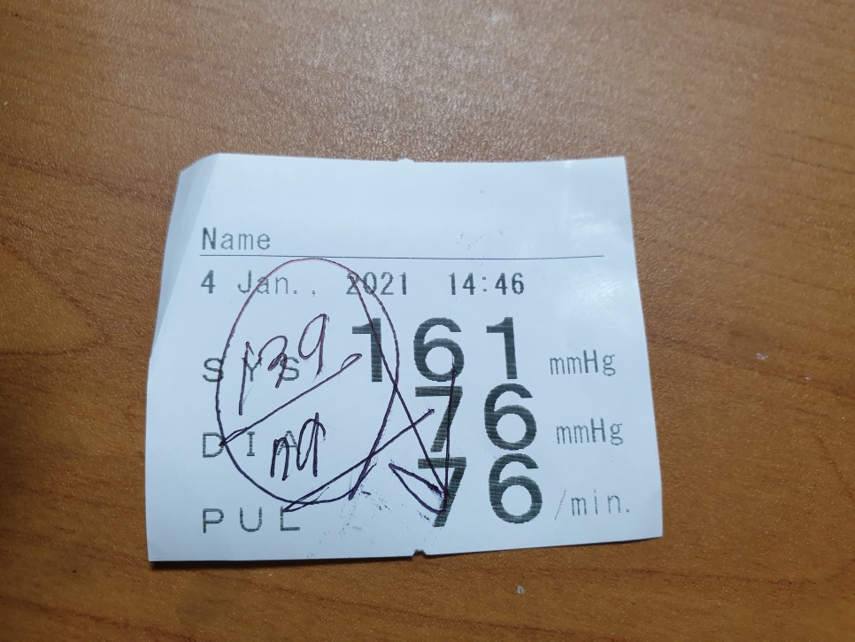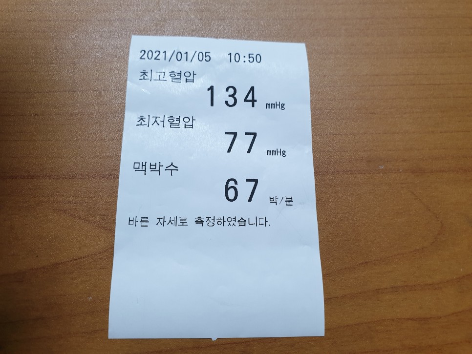 2021/01/04 내과병원 체크 간호사에게 전보다 혈압 수치가 낮아졌다고 했더니 짠 음식을 먹었다거나 말을 많이 하면 혈압이 높아질지도 모른다는 변동사항을 친절하게 알려줘서 고마웠다.