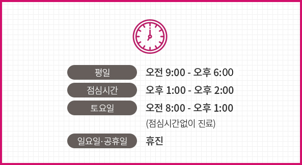 세종핑크유외과는 평일과 토, 요일을 모두 진료하며 토요일에는 낮, 낮, 시, 밤이 없는 오후 2시까지 진료합니다!