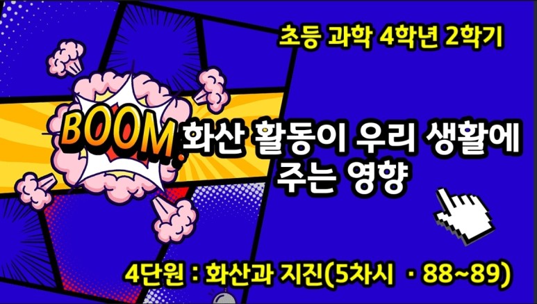 안녕하세요, 이 영상은 4학년 2학기 4단 화산과 지진 수업을 위한 영상입니다 본 과정은 화산 활동이 우리 생활에 미치는 영향을 설명하는 수업에 관한 영상입니다. 본 영상의 구성은 다음과 같습니다.1. 배움의 주제 안내 2. 하와이 킬라웨어 화산 소식(2018) 3. 화산활동의 생활에 미치는 영향 4. 더 생각해볼까요?