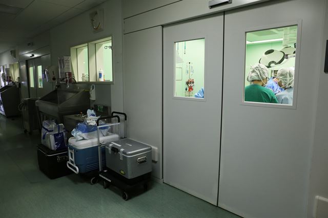 얼마 지나지 않아 간호사와 의사가 수술실로 간다고 하며 이동하기에 긴 복도가 늘어져 있고 복도 오른쪽에는 여러 개의 방이 있는데 그 방을 지날 때마다 창문에 비치는 수술을 하는 모습이 약간 이질적으로 느껴졌다.마치 수술공장 같은? 느낌인데 도축장으로 끌려가는 것 같기도 하고…이른 아침부터 많은 사람들이 이 공간에 누워서 수술을 받는다고 생각하니 기분이 묘했다.