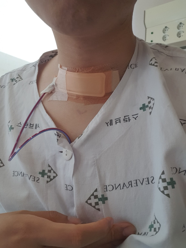 첫째 날:수면가스 때문에 숨 쉴 때마다 아프고, 먹을 때마다 아프다. 녹초가 된 둘째 날:여전히 목은 아프지만 혼자 움직이는 것은 문제없다. 커뮤니케이션도 충분히 가능.3일째 : 갑상선에 연결된 핏줄 배관에서 피가 거의 나오지 않고, 목의 통증이 거의 없어지는 4일째 : 목의 통증도 없으며, 상태에 이상이 없어 퇴원