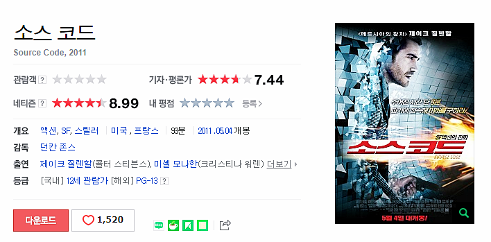 소스코드는 미국, 프랑스의 영화로 2011년 05월 04일에 개봉하여 1시간 30분짜리 영화입니다.국내 관객이 외국 영화이기 때문에 100만이 넘은 영화이기도 합니다.
