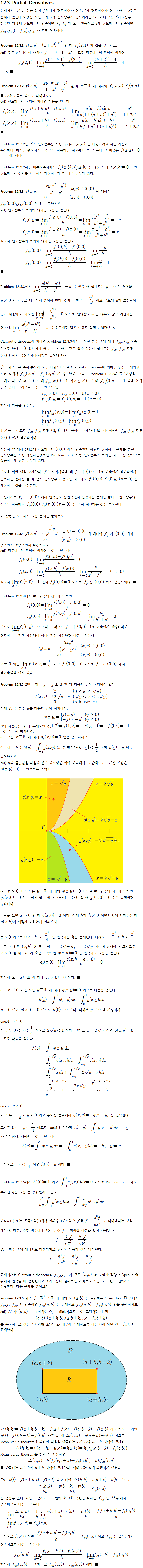 네이버블로그수식편집기가한글문서의수식편집기보다더불편해서스마트에디터ONE의수식편집기는문장바로옆에수식을쓸수없기때문에어쩔수없이이렇게문장을쓰게되었습니다.12.3 편도함수(Partial Derivatives) 문제에서 특별한 언급 없이 의 1계 편도함수가 연속, 2계 편도함수가 연속이라는 조건을 부여할 수 있는데, 이는 모든 1계, 2계 편도함수가 연속이라는 뜻이다. 즉, 가 2 변수 함수일 때, 1계 편도 함수가 연속이면 가 모두 연속이고, 2계 편도 함수가 연속이면 가 모두 연속이다.Problem 12.3.1 때 값을 구하시오.sol) 모두에 대해서이기 때문에 편도함수의 정의에 따르면 말이다. ■Problem 12.3.2 때에 대해서만 부속 식으로 나타냅니다.sol) 편도함수의 정의에 따르면 다음을 얻는다.■Problem 12.3.2는 의 편도함수를 직접 구해 를 대입하고자 하면 계산이 복잡하다. 그러나 편도함수의 정의를 사용하면 계산량이 줄어들게 되는데, 그 이유는 이 때문이다.Problem 12.3.2와 같이 미분적분학에서의 을 계산할 때는, 이면 편도 함수의 정의를 사용해 계산하는 것이 용이한 경우가 많다.Problem 12.3에 대한 값을 구하시오.sol) 편도함수의 정의에 따르면 다음을 얻는다.따라서 편도함수의 정의에 따르면 다음을 얻을 수 있다.