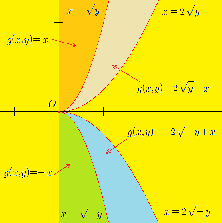 ■Problem 12.3.3부터 실제로는 와인의 경우로 나누어 풀어야 한다. 실제로 극한파이며 분모에 포함되어 있기 때문이다. 하지만 그래서 편의상 케이스를 나누지 않고 계산하는 편이다.를 얻을 때도 같은 이유로 설명을 생략했다.Clairaut’s theorem에 따르면, Problem 12.3.3에서 주어진 함수에 대해 둘 중 적어도 하나는 에서 연속은 아님을 알 수 있지만, 실제로는 모든 것에서 불연속임을 증명해 보자.의 함수식은 분자, 분모 모두 다항식이므로, Clairaut’s의 원점에 의한 원점을 제외한 the mor’s의 원점에 의한 다항식이므로 Clairaut’s 그리고 Problem 12.3.3의 해석 과정을 그대로 따르면 시임을 쉽게 알 수 있다. 따라서 다음을 얻을 수 있다.따라서 다음을 얻는다.그래서 모든 것에 극한이란 존재하지 않는다. 따라서 모두 불연속이다.미분적분학에서 1계, 2계 편도함수가 에서 연속인지 아닌지 판정하는 문제를 풀 때에는 편도함수를 직접 계산하는 것보다는 Problem 12.3.3과 같이 편도함수의 정의를 사용하는 방향으로 접근하는 것이 용이한 경우가 많다.이를 위한 요령을 소개한다. 가 주어졌을 때 가부터 연속인지 불연속인지를 판정하는 문제를 풀 때, 우선 편도함수의 정의를 사용해 를 계산하는 것을 권장한다.마찬가지로 가로부터 연속인지 불연속인지를 판정하는 문제를 풀 때에도 편도함수의 정의를 이용해 를 먼저 계산하는 것을 권장한다.이 방법을 사용해서 다음 문제를 풀어 보자.Problem 12.3.4에 대해서, 「가」로부터 「연속」인가 「불연속」인가를 판정하시오.sol) 편도함수의 정의에 따르면 다음을 얻는다.따라서 ~지만 ~기 때문에 ~은)에서 불연속적이다. ■Problem 12.3.4에서 편도함수의 정의에 의하면, 이다. 따라서 가로부터 연속인지 판정하기 위해서는 편도함수를 직접 계산해야 한다. 직접 계산하면 다음을 얻을 수 있다.때문에 도의 불연속성을 알 수 있다.Problem 12.3.52 변수 함수는, 의 때 이하와 같이 정의되고 있다.이 때, 2 변수 함수를 다음과 같이 정의하자.의 함수 값을 몇 개 구해 보면 말이다.다음 물음에 답하시오.(a) 모든 것에 대한 것임을 증명하라.(b) 함수를 로 정의하자. 이면임을 증명하시오.sol)의 함수 값을 다음과 같이 좌표 평면상에 나타내자. 노란색으로 표시된 부분은 을 만족하는 영역이다.