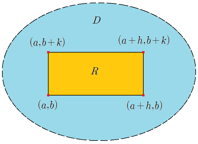 교재에서는 Clairaut’s theorem을 ” ” 가 모든 것을 포함한 적당한 Opendisk 위에서 연속적으로 있을 때 성립한다고 소개하지만, 실제로는 이보다 조금 약한 조건에서도 성립한다. 다음 문제를 풀어보자.Problem 12.3.6 함수에 대해 점을 포함한 Opendisk 위에서 연속이면 존재함을 증명하시오.sol)이 포함 Opendisk이기 때문에 다음 그림과 같이 네 점을 정점으로 하는 직사각형이 내부에 존재하는 것과 같은 오류가 존재한다.