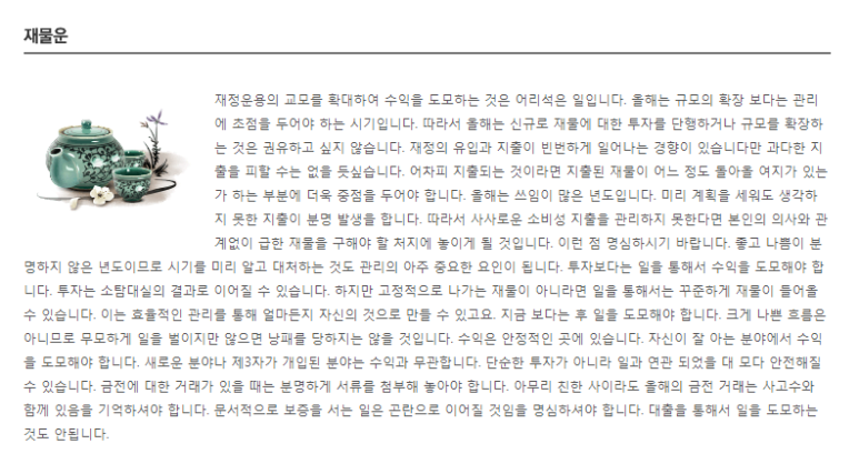 재정적 운용을 가급적 자제하는 것이 좋다.(흐음) 무모한 투자나 재테크를 통한 노력보다는 그동안의 일을 관리하고 점검하고 대운을 기다리는 현명함이 필요하다.