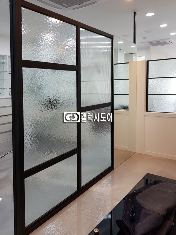 불빛은 보이지만 안과 밖이 잘 보이지 않는 미스트 유리가 장착된 가벽과 여닫이문입니다.
