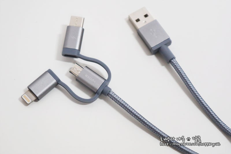 마이크로핀, 라이트닝 8핀, C타입이 Y자형으로 연결되어 있습니다.다른 한 쪽은 USB 포트로 되어 있습니다.길이는 1m입니다.