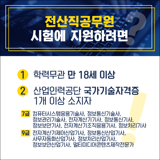 2. 전산직 공무원 : 응시요건, 시험과목 전산직 공무원은 9급 공채시험을 통해서도 필수자격증이 필요합니다.