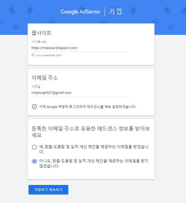 구글 어카운트가 필요해서 위 링크를 통해 구글 어드레스를 신청하면 되는데, 우선 블로그에 계속 약 2주, 하루에 한 가지 퀄리티 있는 게시글(사진과 글의 적정량)을 투고하고 나서 신청하는 것이 좋습니다!