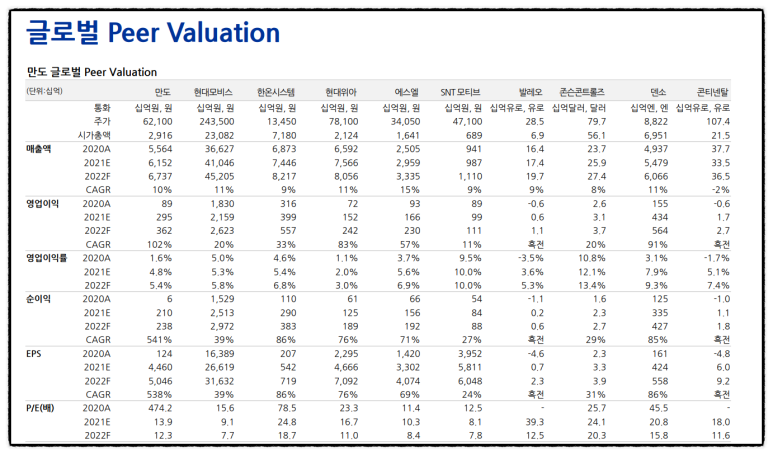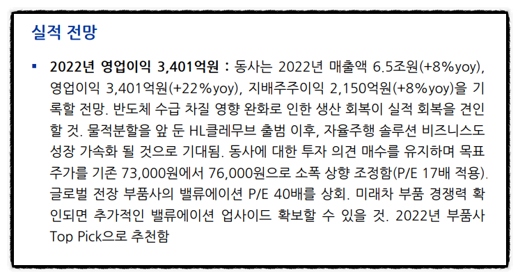 확실한 것은 주가가 오르든 떨어지든, 만도라는 기업의 성장성에는 의심의 여지가 없다는 점입니다. 오늘 하이투자증권 보고서를 보니 22년 자동차 부품주 ‘톱픽’으로 만도를 꼽으셨네요. 목표가격이 가장 낮은 증권사의 시선이 어쩌면 기업의 본질가치에 가장 부합하는지도 모릅니다.