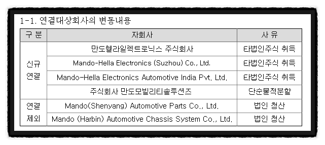 3분기 실적보고서를 연결회사로서의 현황개인투자자의 입장에서 보면 물적 분할은 그다지 달갑지 않습니다. 자율주행사업부문 때문에 현재 이렇게 공부하고 있는 저 같은 사람은 MANDO가 아닌 MANDO 빌리티 솔루션즈(이하 MMS)를 별도로 투자해야 합니다.물론 지금은 비상장기업이고 MMS는 비상장기업이므로 만도를 통해 간접투자하게 되지만 장기적으로는 별도의 상장을 위해 분할한 것으로 해석할 수 있습니다.MANDO 분할 사유에 대해 “각사가 담당하는 사업의 전문성을 강화하고 기업 가치를 높이며 시너지 효과를 강화하는 차원”이라고 합니다.