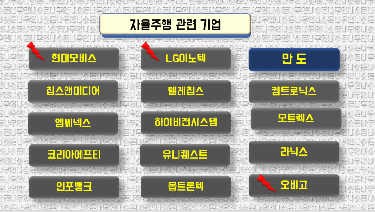 만도는 자율주행 기업, 대형주 중 세 번째 기업입니다. 앞서 공개한 대형주식회사 현대모비스와 LG이노텍에 대한 리뷰 내용은 아래 링크를 참조하십시오.