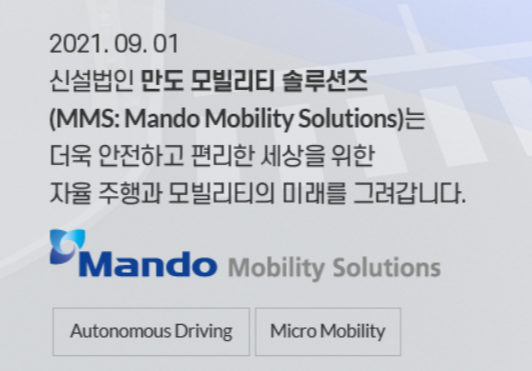 만도 홈페이지 팝업 안내 – MMS는 만도헤라 지분 100%를 취득해 종속기업에 편입주식회사 H.E.클렘브로 사명 변경, 12월 출범 예정