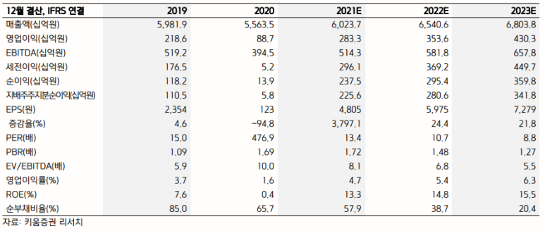 3) 시가총액 및 매출현황 – 시가총액 2.8조-2021년 매출예상 6.05조 내외, 영업이익 280~300억 올해말 기준 예상 PER 13~14.5배 PBR 1.6~1.7, EPS 4663원