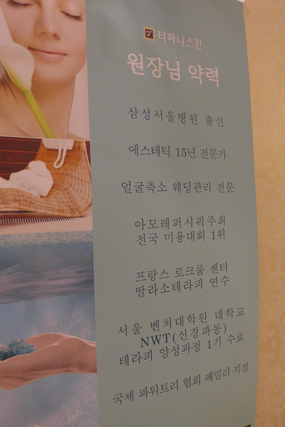 건물 앞에는 티파니스킨에서 하는 각종 돌봄서비스와 요금이 자세하게 표시되어 있다.