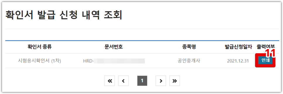 (10) 확인서 발행 신청 내역 조회 메뉴를 클릭합니다.