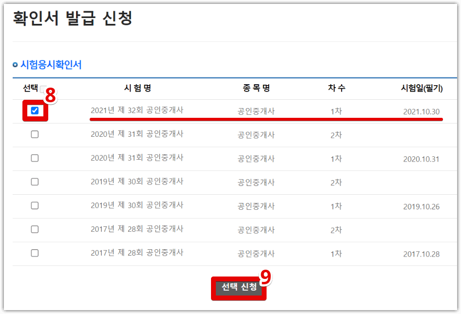 (8) 발행처의 확인서의 시험명을 클릭합니다(9) 아래의 선택신청 버튼을 클릭합니다.