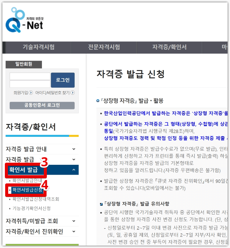 (2) 상단의 ‘자격/확인서’ 메뉴를 클릭합니다.
