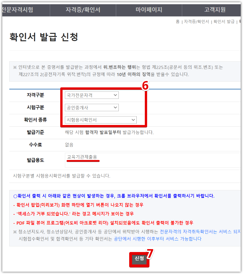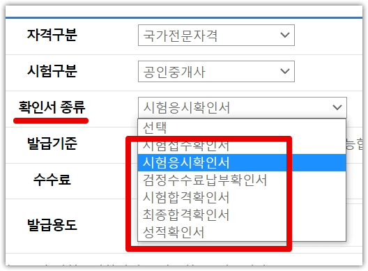 (6) 자격구분, 시험구분, 확인서의 종류를 선택합니다.이하의 발행 용도는 자동적으로 입력되고 있었습니다.