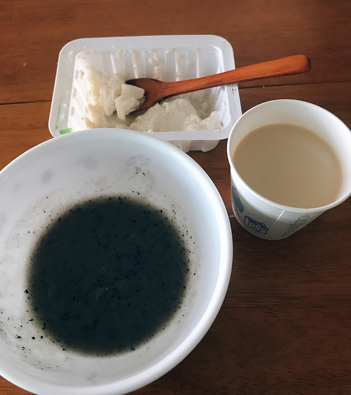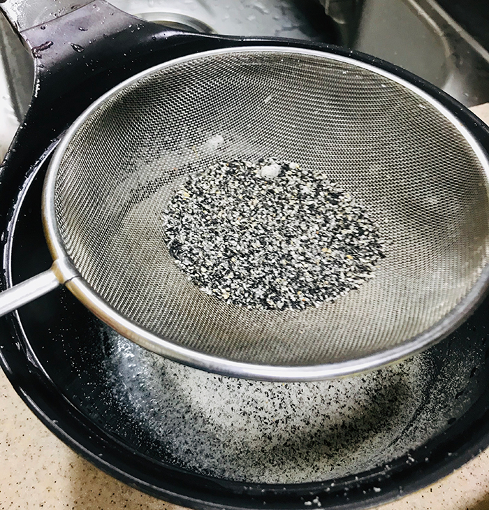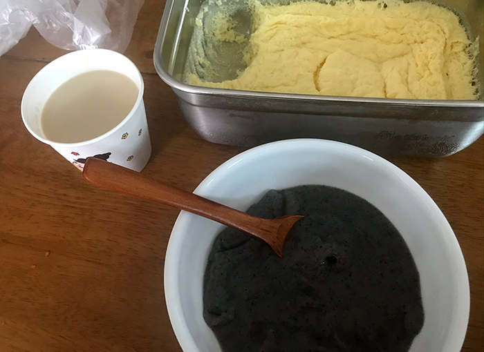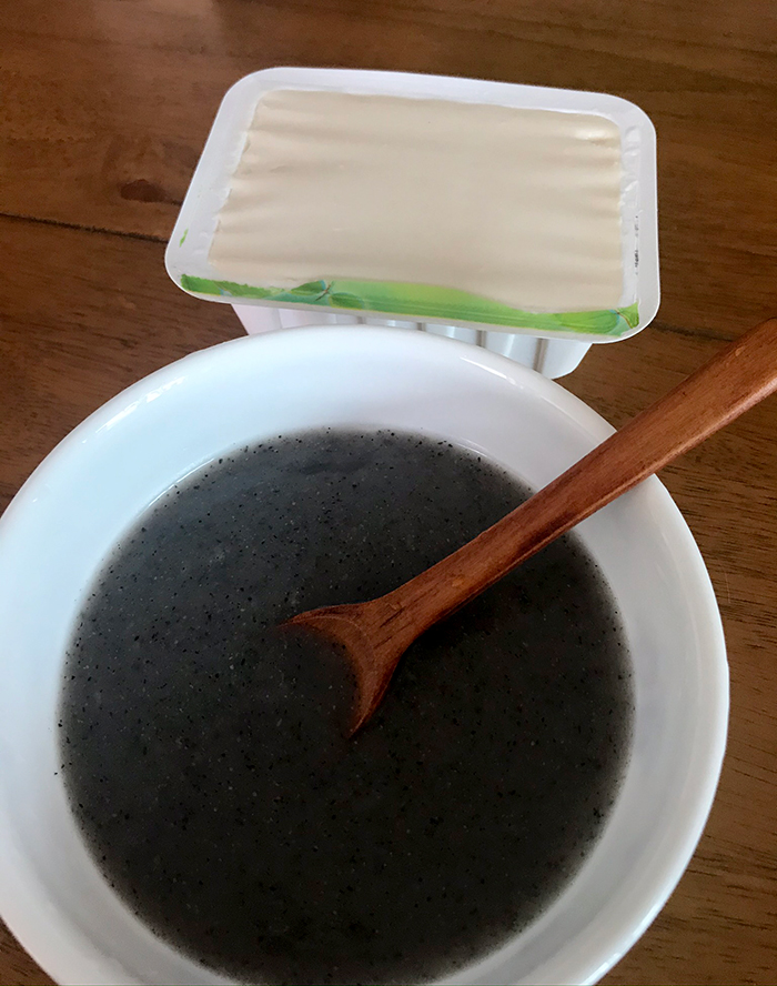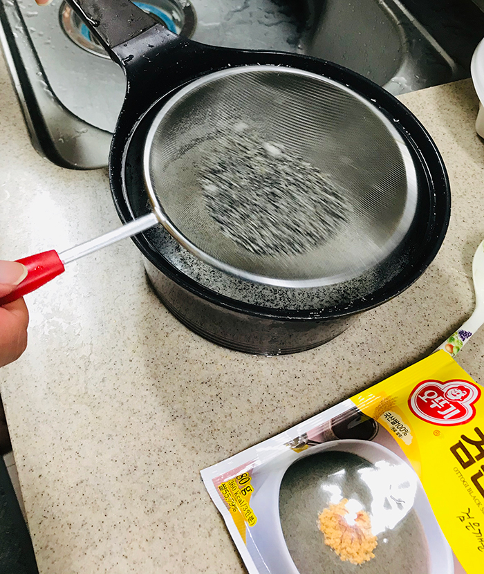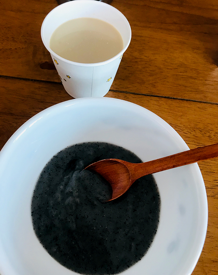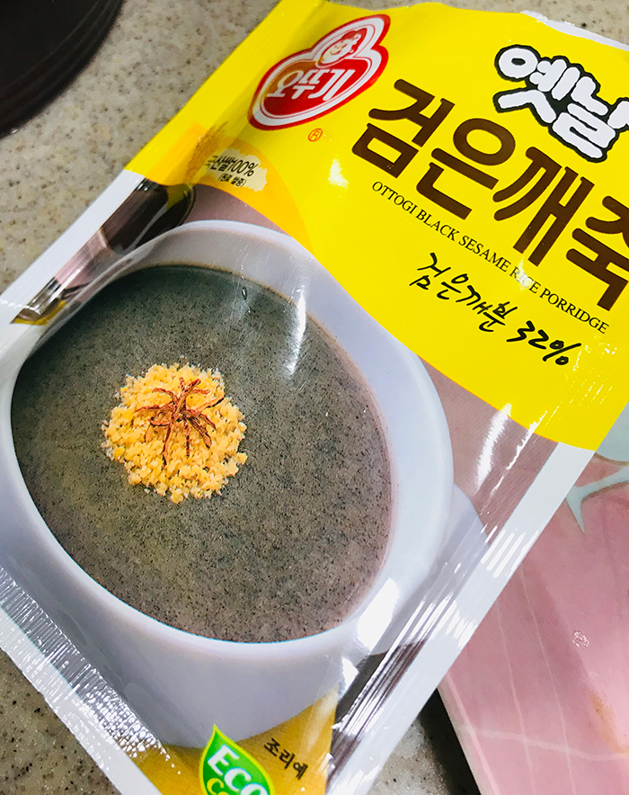 죽은 어머니의 아들이 만들었는데 알갱이가 있으면 안 되기 때문에 검은깨죽을 체에 걸러서 만들었다.위에 사진 중에 알갱이가 있는 흰죽은 너무 짜…