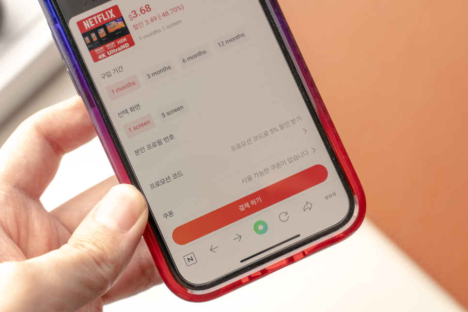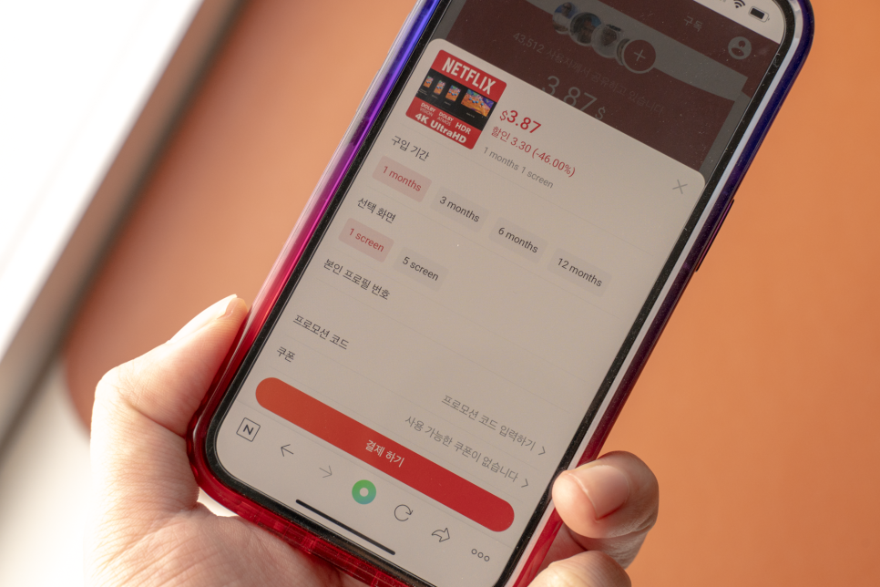 1개월/3개월/6개월/12개월 단위로 결제가 가능하며 해외 결제로 이루어지기 때문에 금액 변동은 있을 수 있으나 1개월 기준 4000원대로 이용이 가능하기 때문에 넷플릭스 가격이 부담스러우신 분들에게는 확실한 장점이라 생각한다.