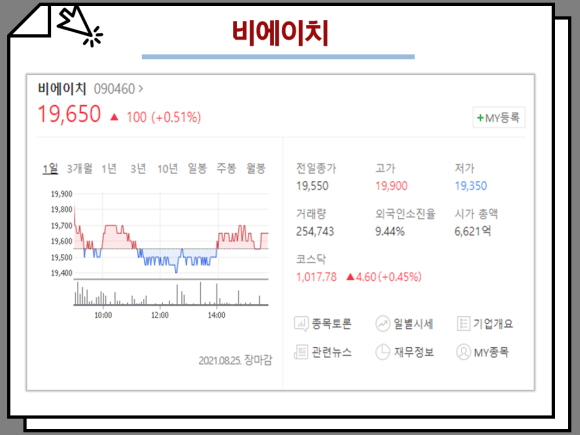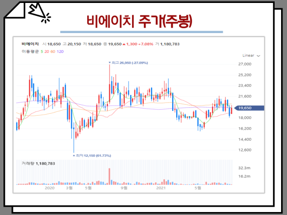 비에이치 주가는 지난해 3월 26,950원까지 떨어졌다가 7월 26,950원까지 오른 뒤 현재 19,650원에서 장중으로 최근 반등하고 있습니다.
