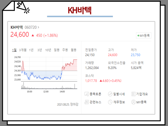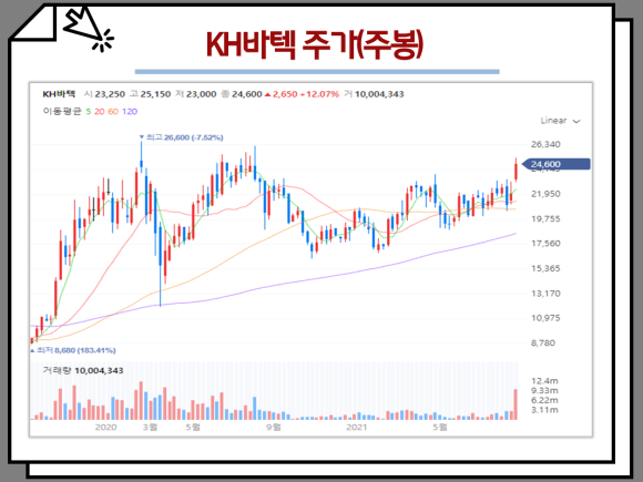 KH바텍 주가는 지난해 3월 00원까지 하락했으나 현재 폴더블폰 관련주에서 상승세를 보이고 있어 24,600원에 거래 중입니다.전 최고치인 26,600원 돌파를 눈앞에 두고 있습니다.