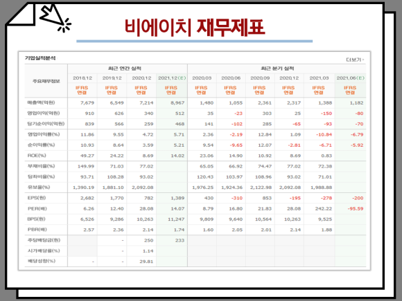 비에이치의 2021년 매출액은 8,967억원, 영업이익은 512억원으로 전년 대비 상승할 것으로 예상하고 있습니다만 하반기 글로벌 경기 개선과 5G 안테나 케이블, FPC 수요 증가가 기대되기 때문입니다.