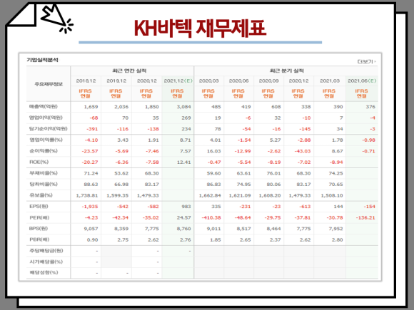 KH바텍의 2021년 예상 매출액은 3,084억원, 영업이익은 269억원으로 전년대비 대폭 상승할 것으로 예상되고 있습니다.