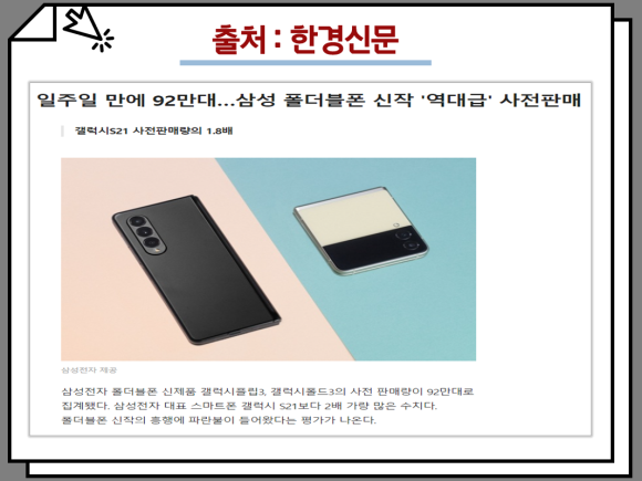 최근 삼성에서 출시된 Foldable Fhone의 사전 판매량이 92만 대를 돌파했는데, 이는 갤럭시s21의 약 2배에 해당하는 수치로 주목 받고 있습니다.