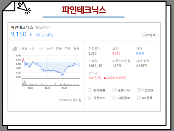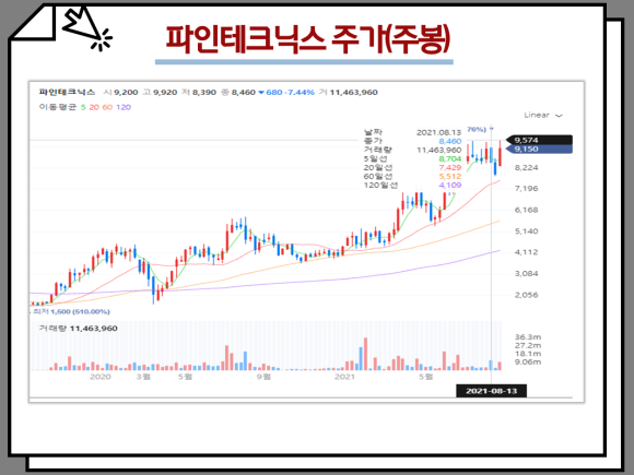 파인테크니스 주가는 지난해 3월 1,610원까지 떨어졌다가 올해 8월 최고 9,150원까지 올랐고, 지금도 반등에 성공해 9,150원에 장중이어서 전고 돌파를 눈앞에 두고 있습니다.