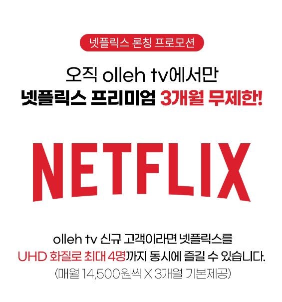 KT 올레TV 넷플릭스 요금제를 쉽게 살펴보면 올레TV 에센스 요금이 월 16500원인데 넷플릭스 프리미엄 요금제는 17000원을 합쳐 월 33500원인데 6000원 할인 혜택으로 월 27500원의 요금을 내게 됩니다. UHD 화질과 4가지 프로필을 공유할 수 있어 모바일과 태블릿은 물론 TV와 PC 등 모든 스마트 기기에서 즐길 수 있다는 장점 때문에 선호도가 높습니다. 솔직히 대형 화면으로 즐기는 넷플릭스는 그 감동이 달라요.