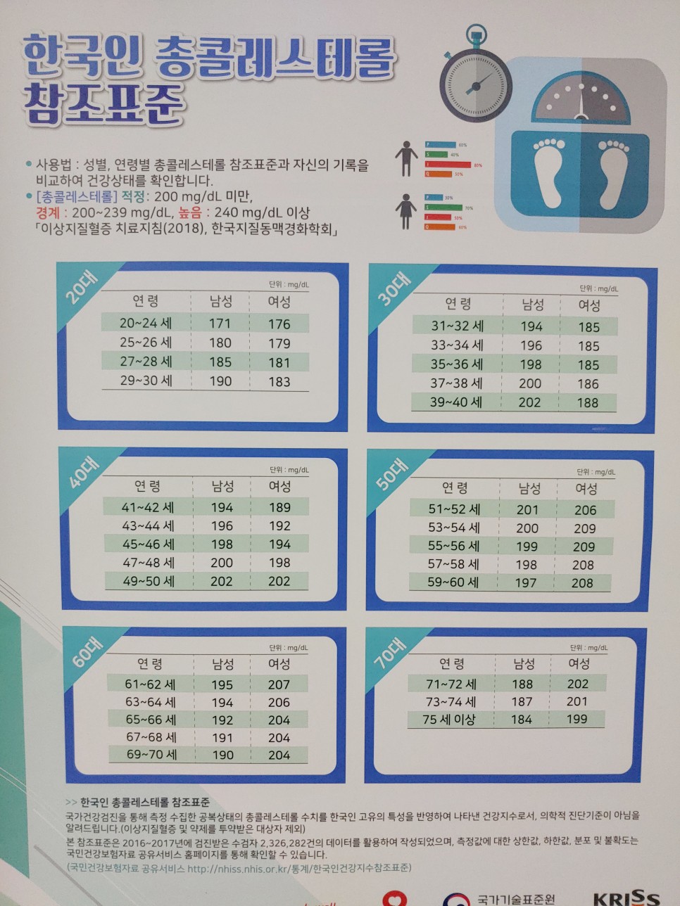 총 콜레스테롤 수치: 200 미만 정상, 200~239 경계, 240 높은