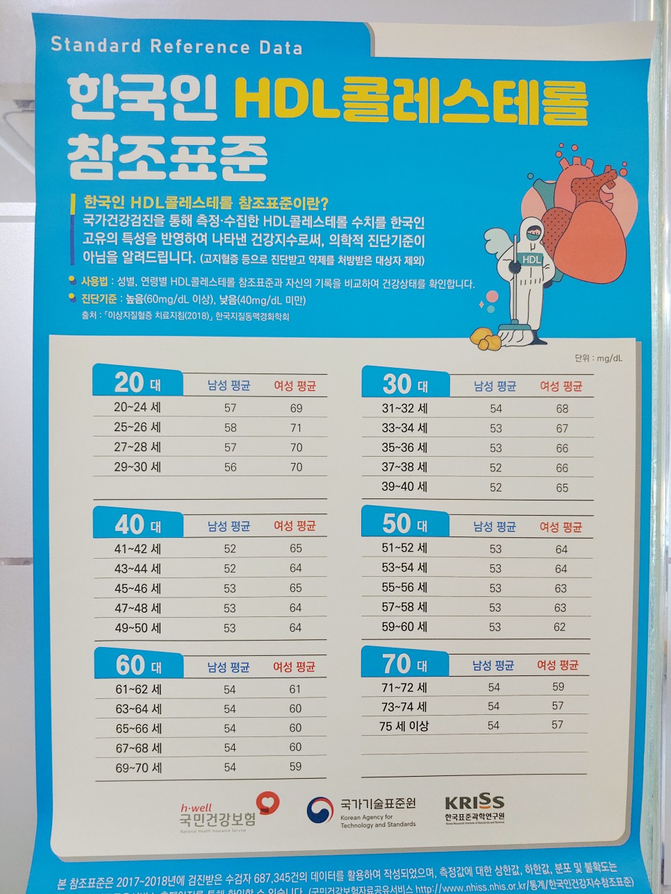HDL 콜레스테롤 수치: 60 이상 정상, 40 이하 낮음