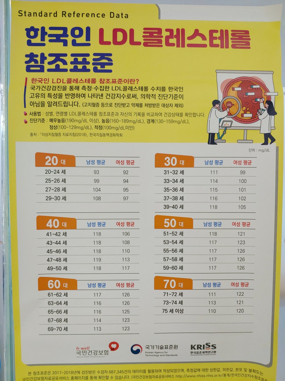 LDL 콜레스테롤: 100 미만, 100~129 정상, 130~159 경계치, 160~189 높음, 190 이상 매우 높음